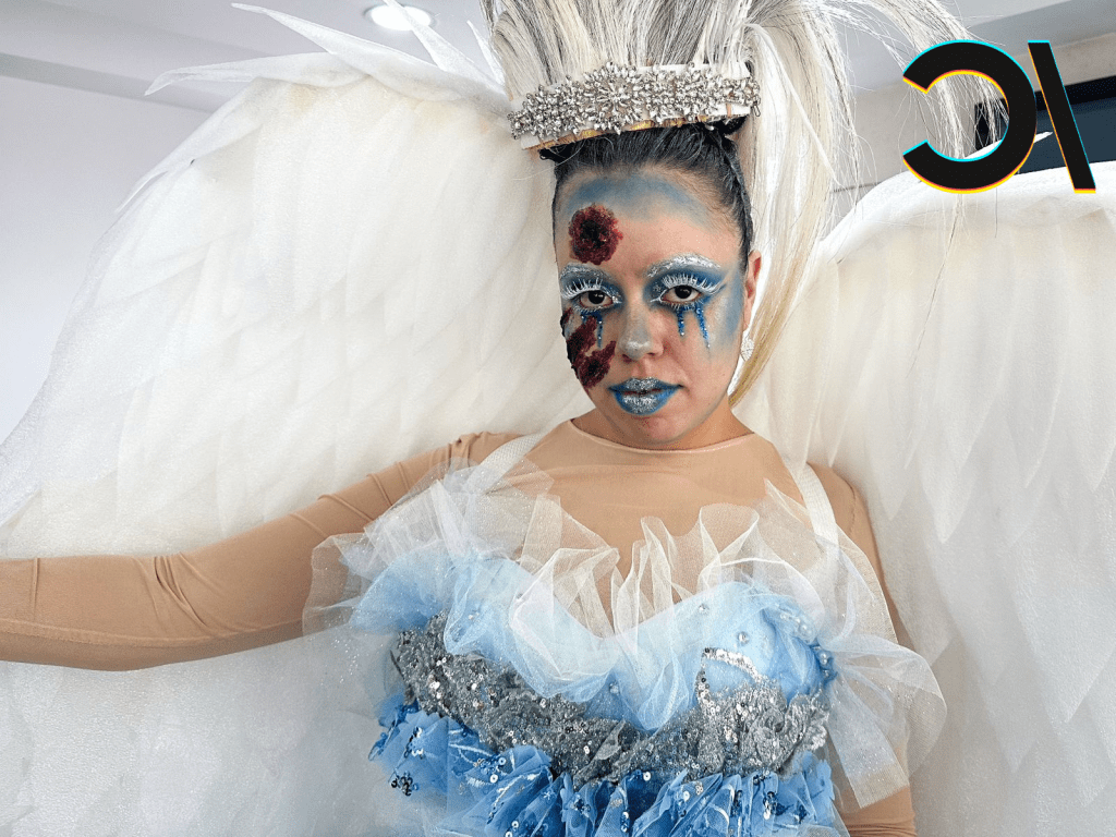 Antes de salir, la familia se ha reunido en la casa familiar, muy de mañana. En la sala de la vivienda está Jaqueline Carbajal, a quien aplican un elaborado maquillaje que la transformará de manera radical. Ahora mismo, su rostro es cuidadosamente esculpido con pintura azul brillante y le han colocado heridas falsas que recorren una de sus mejillas. El peinado alto y platinado hace juego con su vestido lentejuelado. Cuenta que es la segunda ocasión que se caracteriza de esta manera; sin embargo, tuvieron que pasar años para que se decidiera a usar un disfraz tan elaborado. El nivel de complejidad del atuendo la obligó a despertarse a las cuatro de la mañana para comenzar su transformación. Mientras terminaban de colocarle unas enormes alas en la espalda, dijo que deseaba llegar con bien a la iglesia, deseando que los asistentes disfrutaran tanto como ella de ese disfraz.