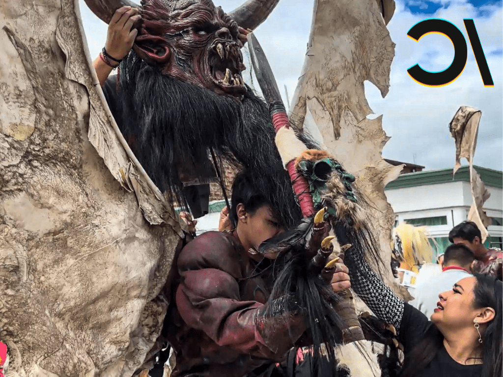 La solidaridad y el apoyo resultan imprescindibles a la hora de colocarse los trajes. Y es que nada más para ponerse una pesada máscara en la que se ve la cara de un demonio, es necesaria la ayuda de hasta dos personas. Entre el disfraz completo y los zancos, que también llevan algunos pregoneros, se alcanza alturas de más de dos metros. Al igual que las mujeres, los hombres también usan unas enormes alas, pero las de ellos son fabricadas en piel.