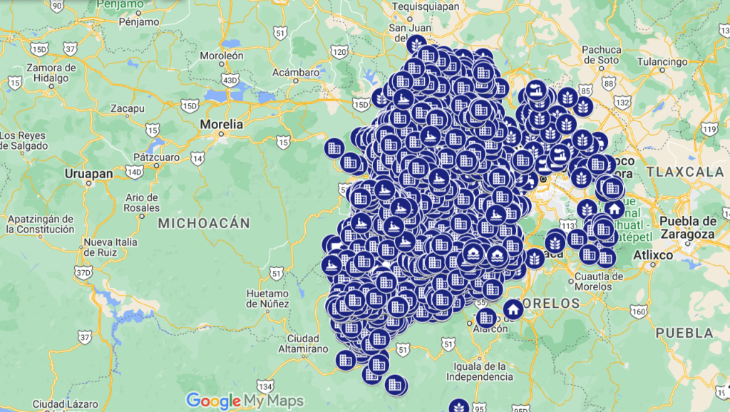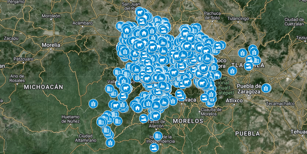 Además, pueden observarse en los mapas irregularidades en los registros de coordenadas de ubicación que colocan puntos en otras entidades y países.