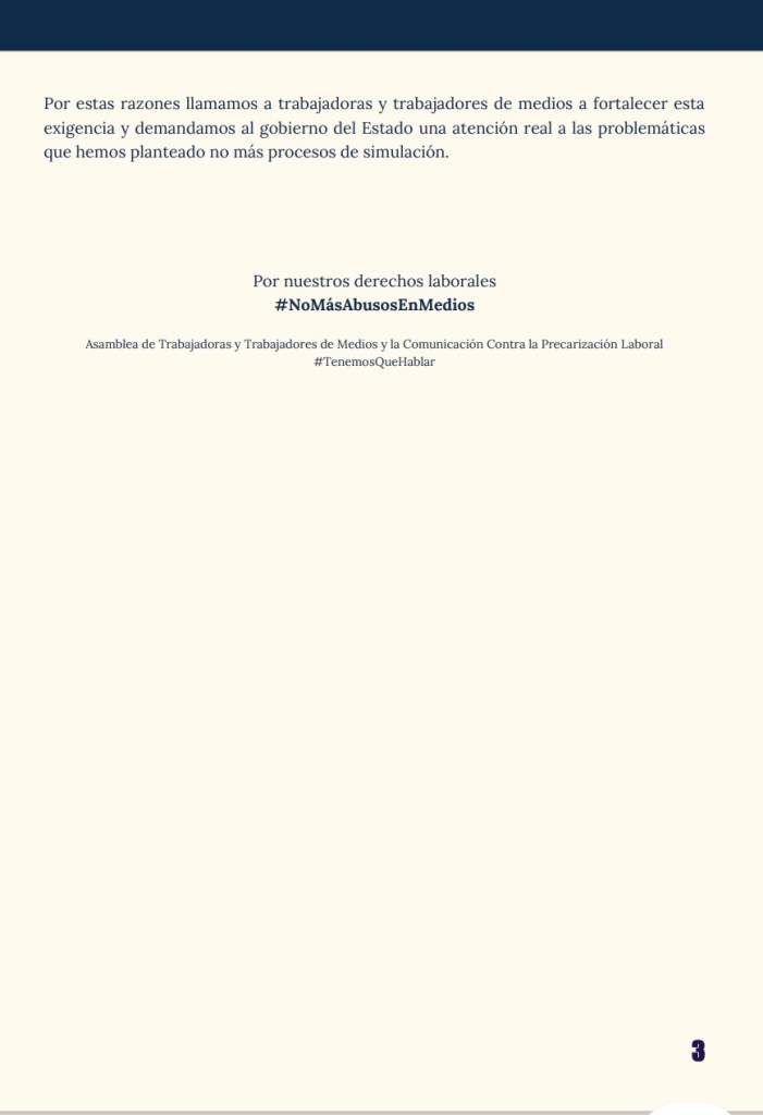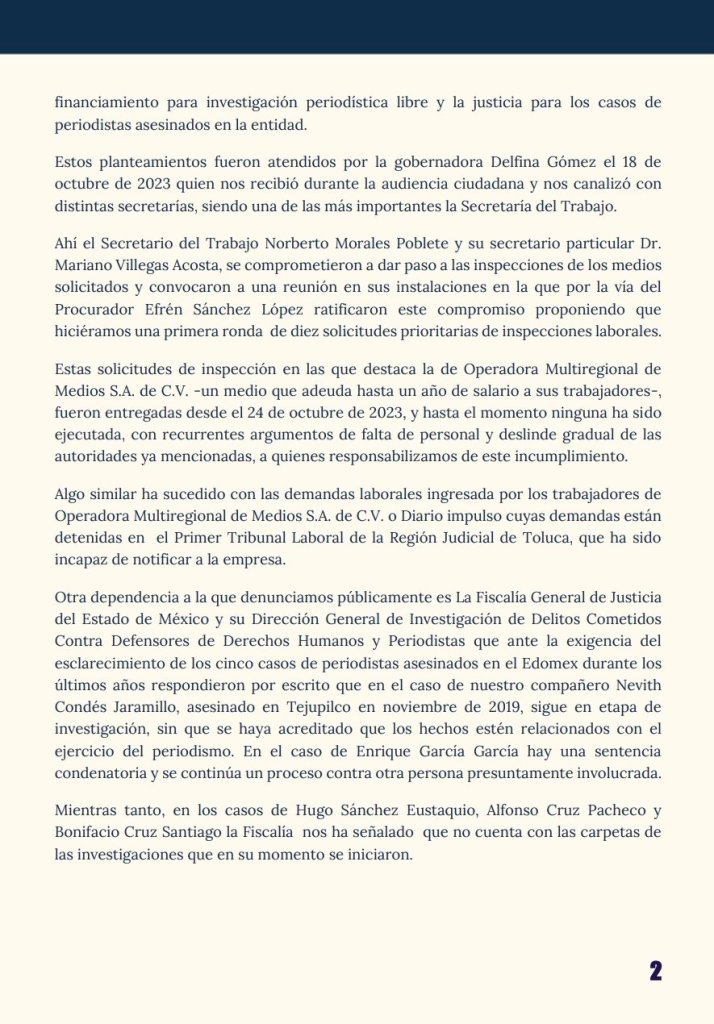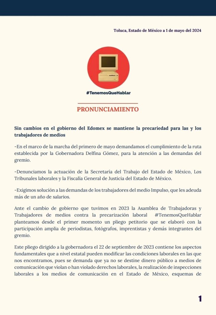 Otros participantes fueron la Asamblea de Trabajadores de Medios Contra la Precarización Laboral Tenemos que hablar, cuyos integrantes denunciaron públicamente el incumplimiento que ha tenido la Secretaría del Trabajo en la entidad, la Fiscalía General de Justicia del Estado de México y el Primer Tribunal Laboral de la Región Judicial de Toluca.