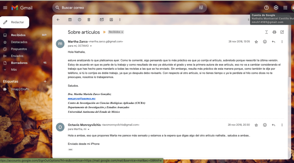 Previo a nuestra publicación pudimos verificar una serie de correos en los que se observa que la comunicación con Nathalia Montserrat se dio a través de otro correo en el que además la Dra. Martha Zarco confirma que ella es la primera autora del artículo. ¿Esto no contradice lo que afirman en su réplica respecto a que la comunicación se dio en otro correo y a que la Bióloga siempre fue considerada para su coautoría?