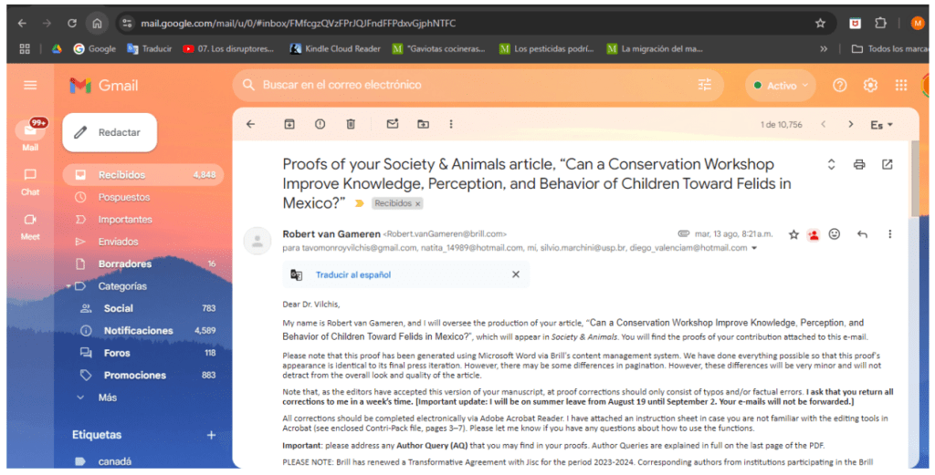 Posteriormente, en 2022, decidimos retomar la información del artículo, y revisar, actualizar, analizar, y generar una nueva versión. Finalmente, enviamos el artículo a la revista que nos notificó que debíamos realizar y atender observaciones y comentarios de los revisores si queríamos que el artículo fuera publicado, lo analizamos y corregimos para llegar a otra versión que reenviamos a la revista. Desde el envío en 2022 y hasta la aprobación del artículo, todos los coautores eran avisados a través de sus correos electrónicos, que en el caso de la Biól. Castillo Huitrón era el que teníamos registrado (natita_14989@hotmail.com).