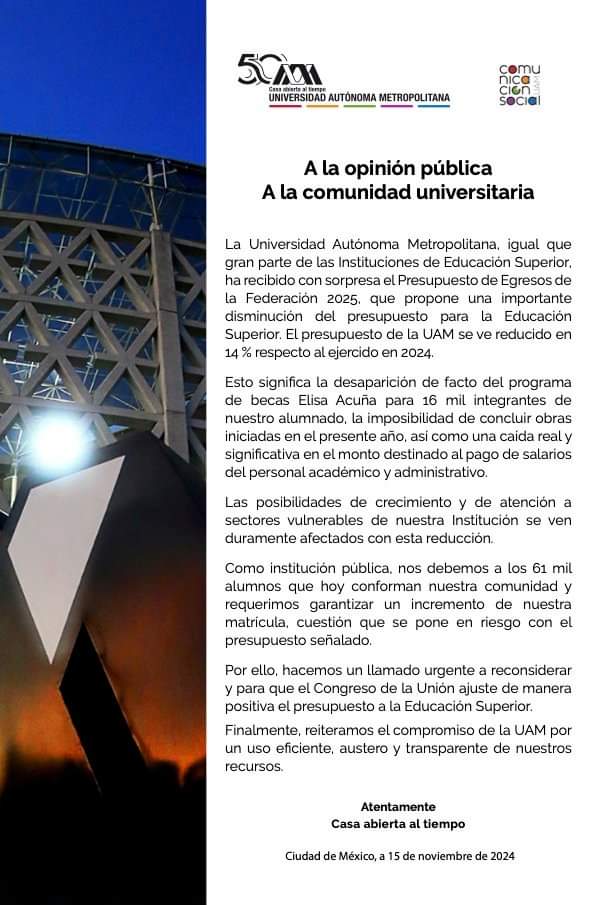Sin embargo, esta aclaración no evita que el presupuesto federal sí se reduzca para otras instituciones públicas de educación superior, que –como se observa en el proyecto entregado por la Secretaría de Hacienda y Crédito Público a la Cámara de Diputados– sí muestran una reducción respecto al año pasado, tal es el caso de la más afectada: la Universidad Autónoma Metropolitana (UAM), cuya reducción es de 14.1 por ciento nominal y 17.6 real, es decir, mil 337,1 millones de pesos menos y cuya reducción, según un comunicado de la UAM significaría “la desaparición de facto del programa de becas Elisa Acuña para 16 mil estudiantes, la imposibilidad de concluir obras iniciadas en el presente año, así como una caída real y significativa en el monto destinado al pago de salarios del personal académico y administrativo”.