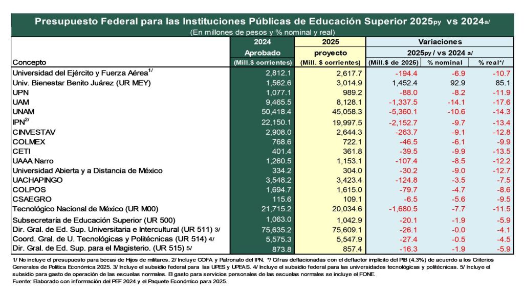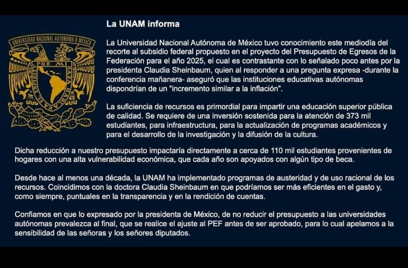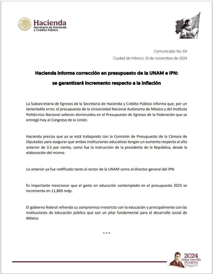 Luego de que se anunciara una reducción de 5 mil 360.1 millones de pesos en el presupuesto que la federación daría a la Universidad Nacional Autónoma de México en 2025 y de 2 mil 152.7 millones de pesos para el Instituto Politécnico Nacional, la Secretaría de Hacienda emitió un comunicado donde señaló que se trataba de un “lamentable error” y que se estaban realizando los ajustes para –como lo había anunciado la presidenta Claudia Sheinbaum– no sólo se respetara el presupuesto sino que se daría un incremento “similar a la inflación”.