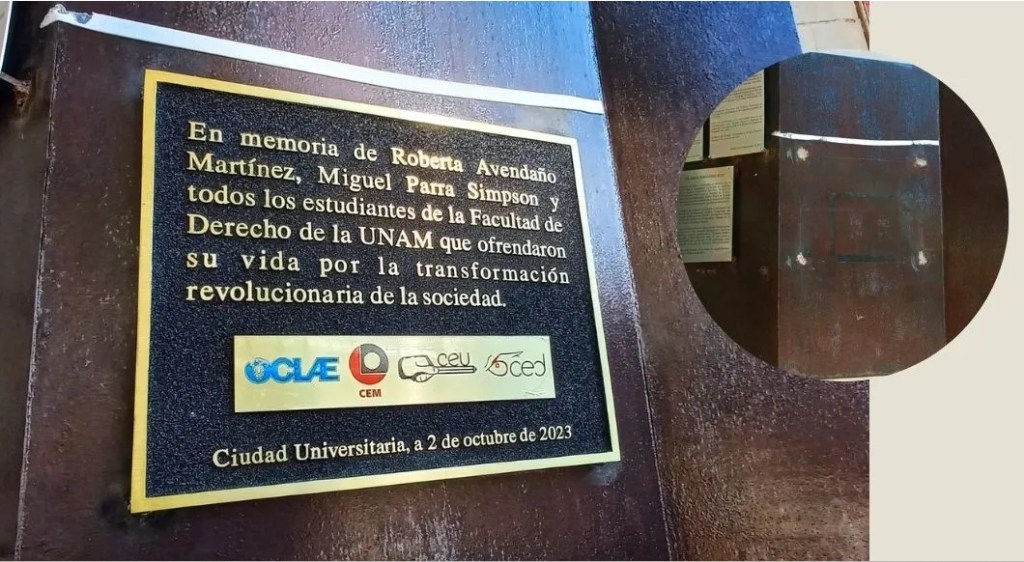 Hacia abril de 2024 este tema llegó a un punto inquietante, generado por una controversia que se dio en la Facultad de Derecho de la UNAM, de donde fue desprendida de sus pasillos una placa con los nombres de Roberta Avendaño Martínez y Miguel Parra Simpson, alumnos de esa institución y miembros históricos del movimiento estudiantil de 1968. La placa, colocada en los pasillos de la Facultad, junto a otras de miembros destacados de la comunidad, fue desprendida y destruida a juicio de una autoridad que sostuvo que no jugaron un papel relevante ni para la institución ni para el país, mirada extraordinaria en un México cuyo discurso político hoy blande el valor de una democracia (mediana) a la que se llegó vía esas luchas históricas y que lograron poner en el poder a quienes hoy, efectivamente, lo ejercen y administran, regodeándose como herederos de esas luchas de vanguardia.