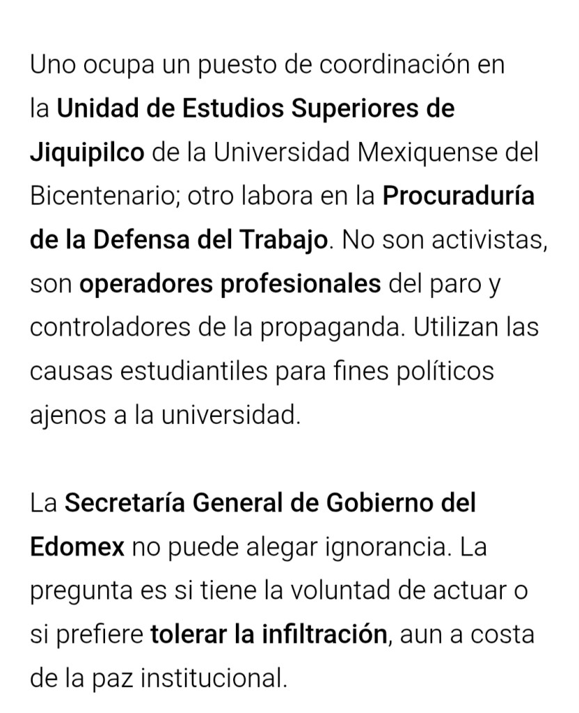 El reciente intento por deslegitimar nuestro trabajo trata de contraponernos con el movimiento estudiantil de la UAEMéx. Los señalamientos de AD Noticias, emitidos sin pruebas, desde el anonimato y con claras intenciones difamatorias, no sólo buscan desacreditar nuestro trabajo periodístico, sino que constituyen un ataque directo a los derechos fundamentales de quienes ejercemos esta labor. Peor aún, esa columna llamada “Se dice que…”, parece incitar al Gobierno del Estado de México para que tome represalias en nuestra contra, revelando así su verdadero objetivo, el cual es silenciar las voces críticas que denuncian sus vínculos con el poder y su historial de violencia laboral. Exigimos un alto a esta campaña de hostigamiento, que busca distraer a la opinión pública de la lucha legítima que realizan los estudiantes de la UAEMéx.
