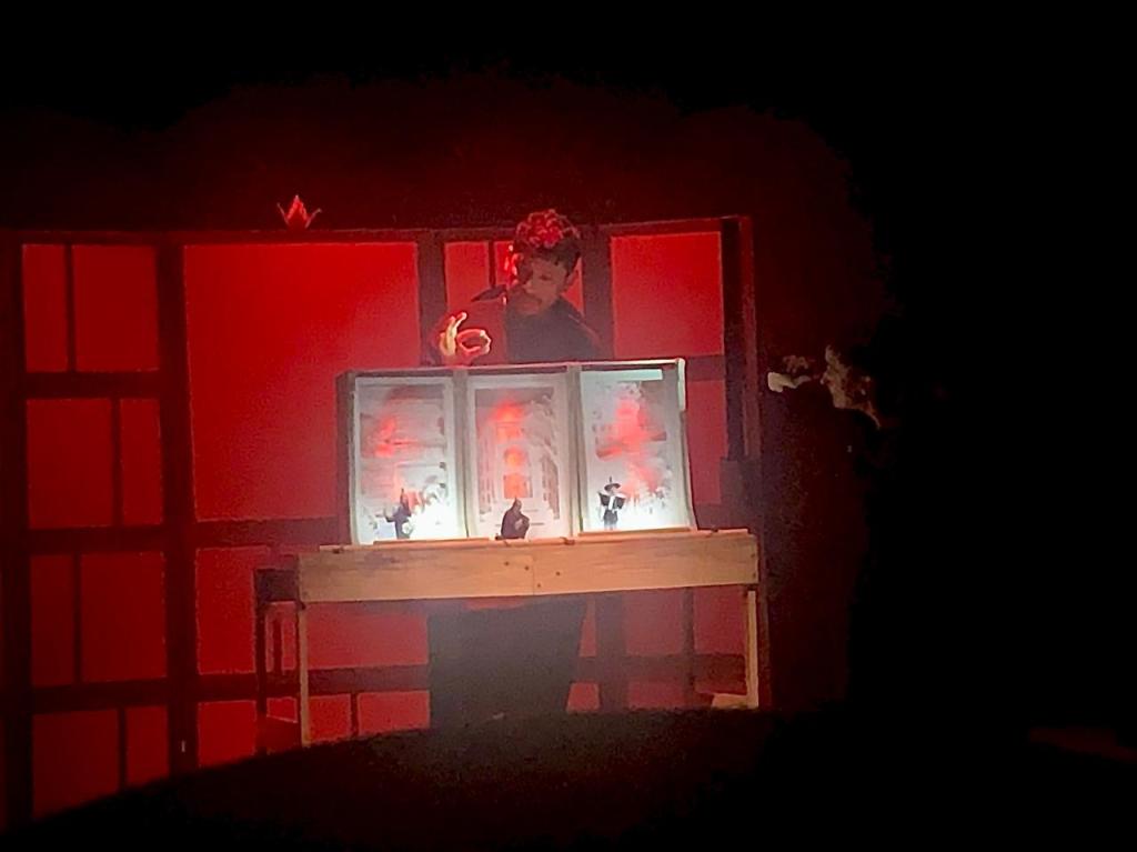 En la escena, las imágenes se configuran poéticamente: desde los recursos del juego de piedra papel y tijera, los elementos se transforman ante los ojos de los espectadores en los personajes que construyen la historia de un niño y una niña que sobreviven al lanzamiento de la bomba atómica más destructiva que se ha lanzado sobre población civil.