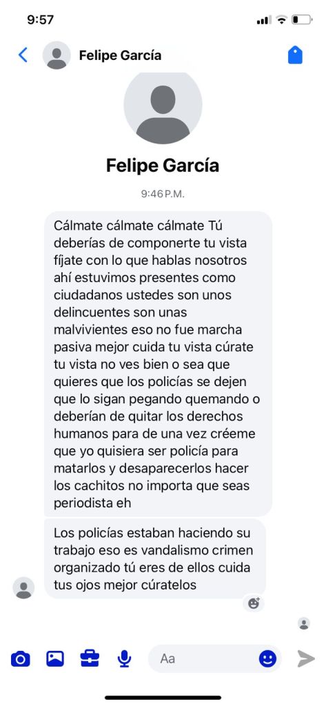 El video, publicado el 7 de octubre, fue de inmediato comentado por los propios policías municipales, quienes dejaron escritas amenazas y burlas. Un día después, una amenaza directa fue recibida por el perfil de facebook a nombre de “Felipe García”, quien escribió: ”yo quisiera ser policía para matarlos y desaparecerlos, hacerlos cachitos, no importa que seas periodista”.