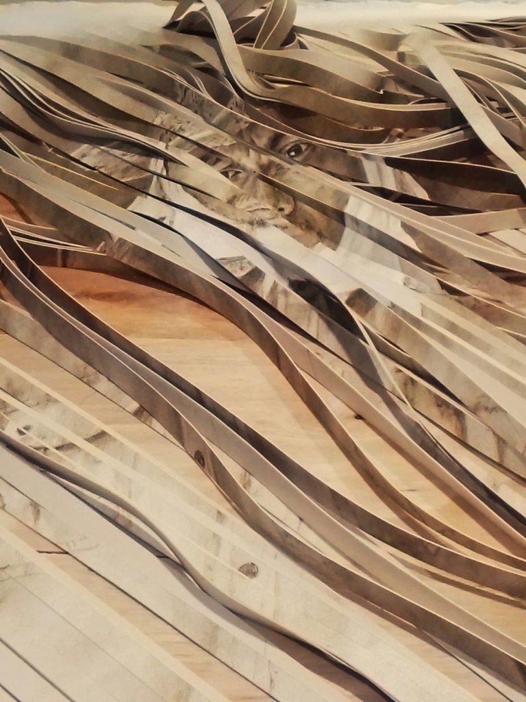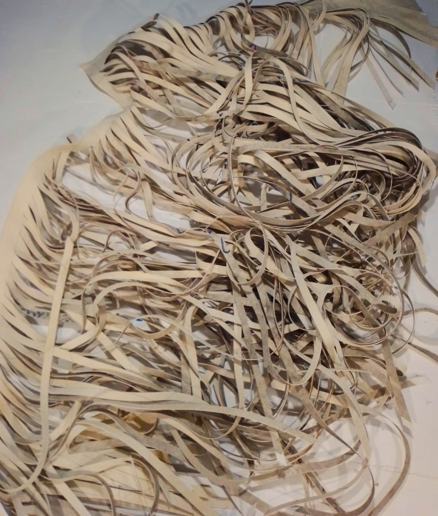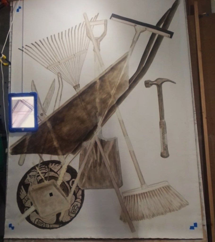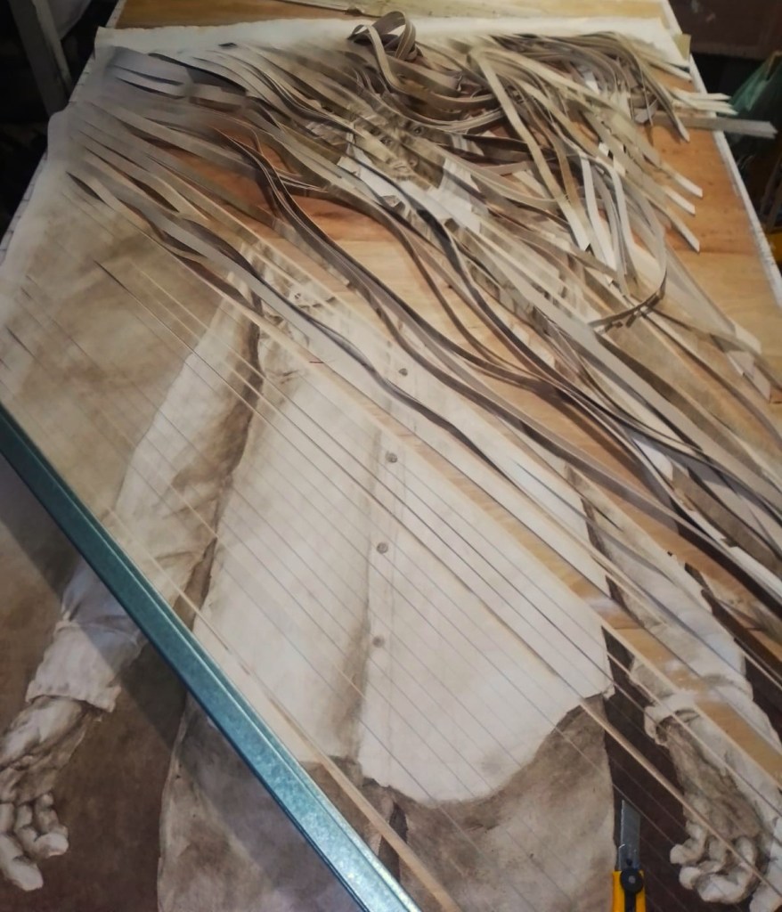Con él realizó dos lienzos: en uno plamó sus herramientas de trabajo —escoba, recogedor, pala, rastrillo, carretilla, martillo— y otro fue un autorretrato vestido con su ropa de conserje. Después, ambos lienzos fueron cortados en tiras y tejidos entre sí.