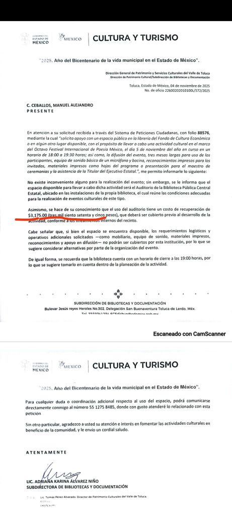 El documento de respuesta, firmado por Adriana Karina Álvarez Niño, subdirectora de Bibliotecas y Documentación, señala que el espacio disponible para la actividad sería el Auditorio de la Biblioteca Pública Central Estatal, no obstante «el uso del auditorio tiene un costo de recuperación de $3,175.00 (tres mil ciento setenta y cinco pesos), que deberá ser cubierto previo al desarrollo de la actividad”.
