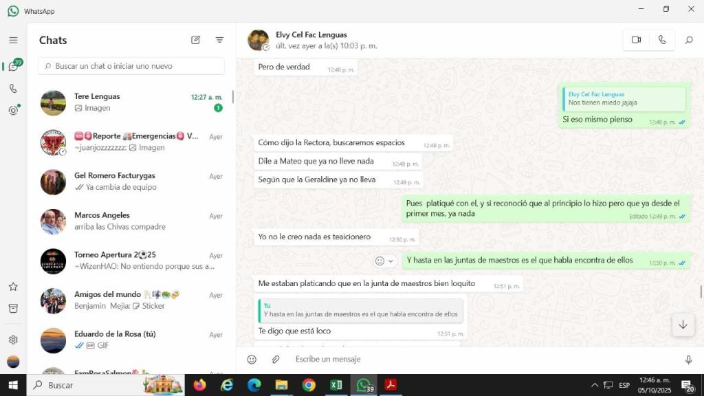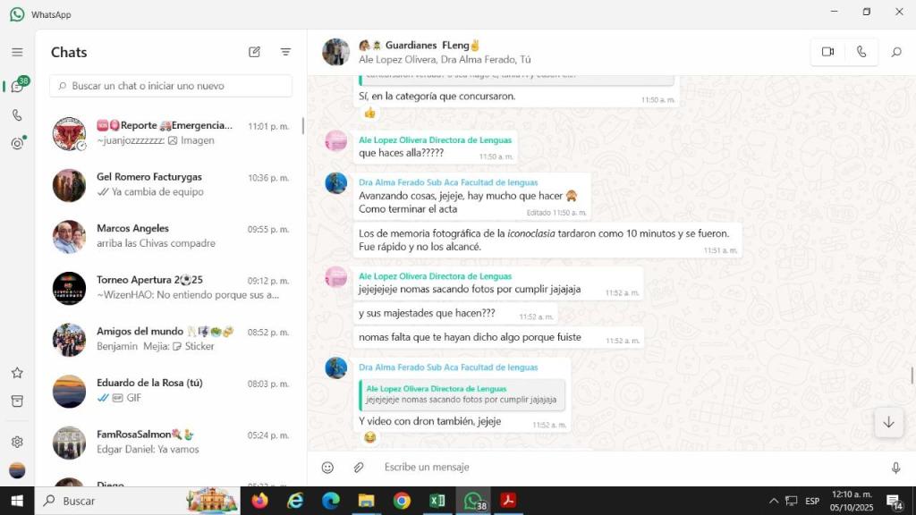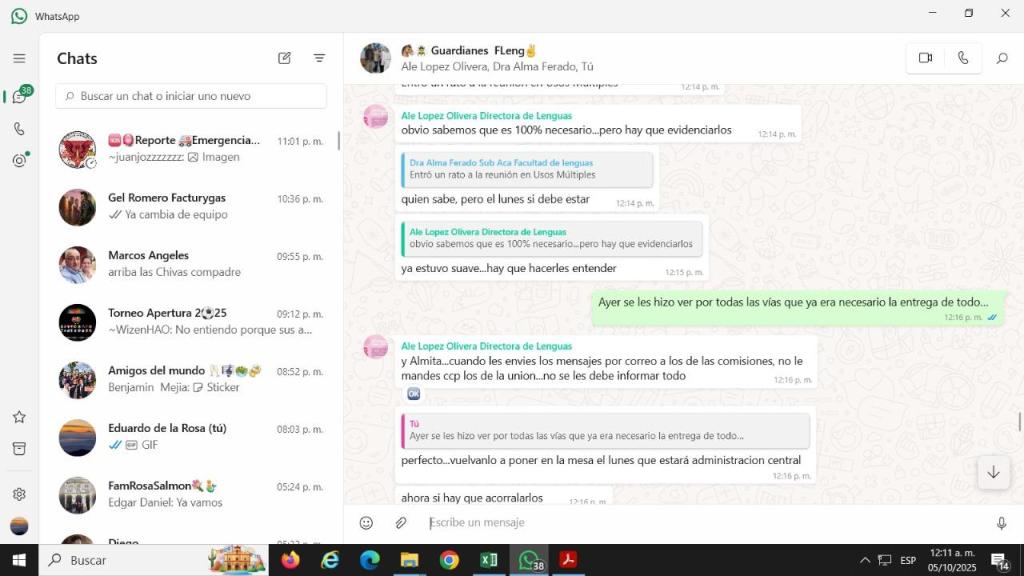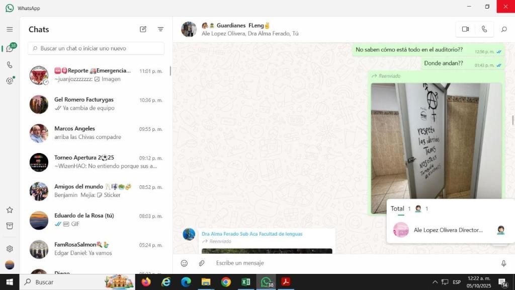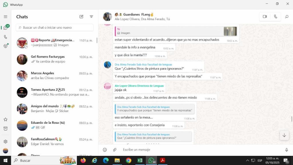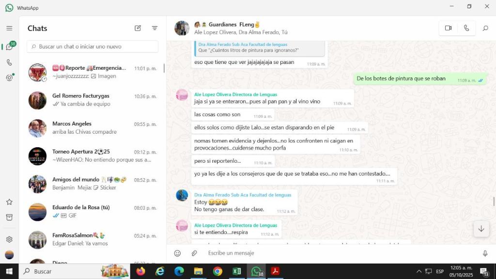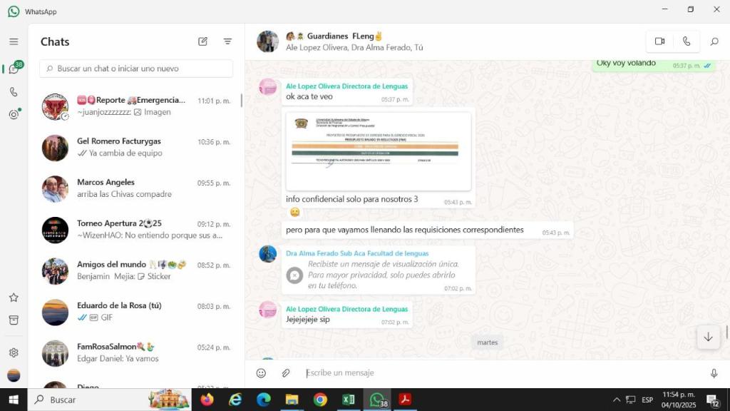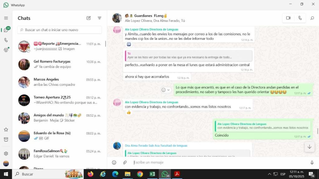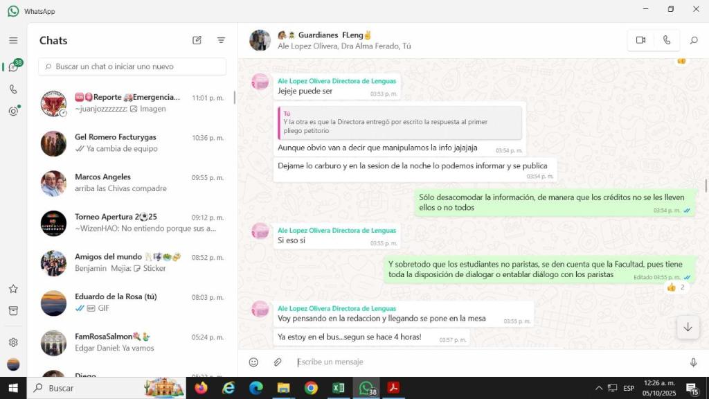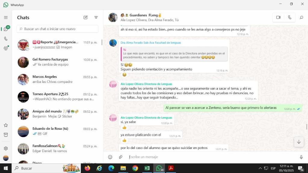 Mediante este escrito hago pública una denuncia relacionada con hechos de extrema gravedad ocurridos dentro de la Facultad de Lenguas de la Universidad Autónoma del Estado de México (UAEMex). Han salido a la luz capturas de pantalla de conversaciones privadas sostenidas vía WhatsApp por integrantes de la administración de dicha Facultad: la directora, Alejandra López Olivera; la subdirectora académica, Alma Leticia Ferado; y el subdirector administrativo, Eduardo de la Rosa.